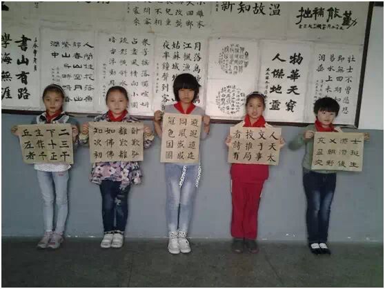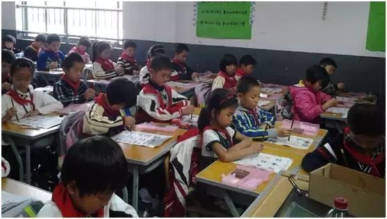 资金到位后,郭老师很认真地带领孩子们练习。为了激发学生的兴趣,老师拿出自己书写的作品和高年级学生书写的作品作为范例。课堂上,老师教导学生执笔方法与写字姿势,要求:五指执笔法(按、压、钩、顶、抵)、头正、身挺、脚平。学生练习过程中,教师会巡回指导,指出优缺点,学生再根据自己的缺点加以练习改正。